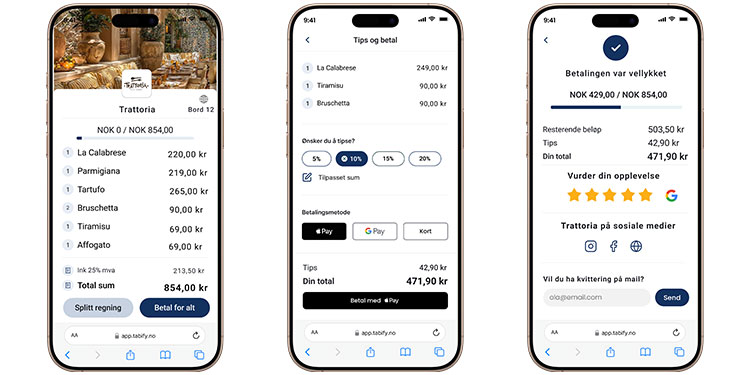 Tabify lar restaurantgjester se, splitte og betale regningen direkte ved bordet fra mobilen – uten app eller nytt utstyr. Resultatet er raskere bord turnover, høyere tips og mindre press på servitører.