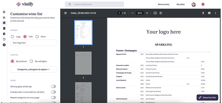Automatisk vinkart: Generer et vinkart på et sekund, både for print i restauranten og for nett. Alltid oppdatert.
